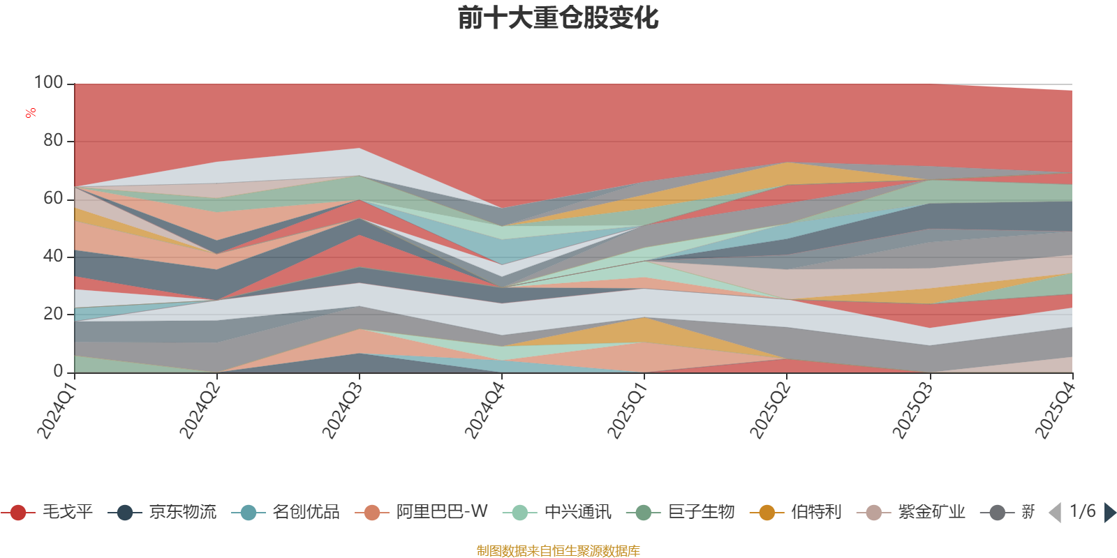 該基金持股集中度較高。截至2025年四季度末,基金十大重倉(cāng)股分別是中際旭創(chuàng)、新易盛、劍橋科技、源杰科技、騰訊控股、勝宏科技、海博思創(chuàng)、紫金礦業(yè)、工業(yè)富聯(lián)、康方生物。