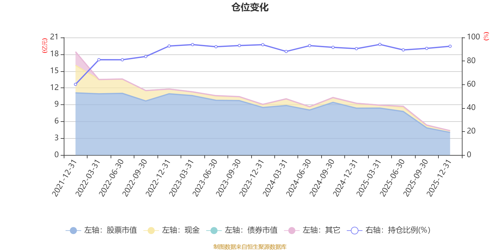 據(jù)定期報告數(shù)據(jù)統(tǒng)計,近三年平均股票倉位為91.95%,同類平均為87.23%。2025年一季度末基金達(dá)到94.13%的最高倉位,2021年末最低,為60.17%。