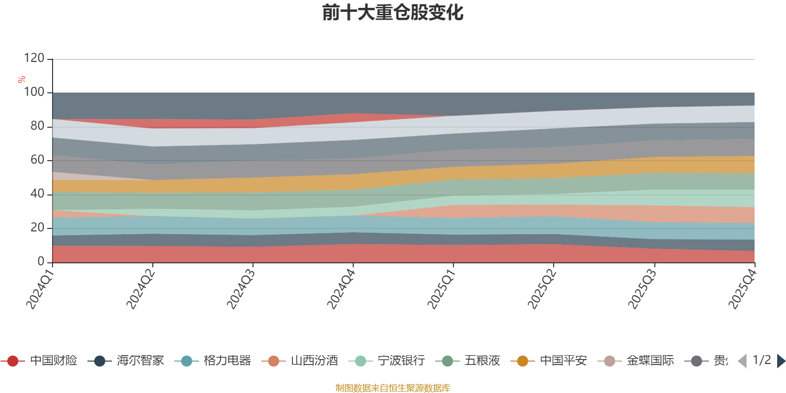 該基金持股集中度較高,且持股標(biāo)的較為穩(wěn)定,近2年前十大重倉股集中度長期超過60%。截至2025年四季度末,基金十大重倉股分別是中國平安、寧波銀行、貴州茅臺、招商銀行、美的集團(tuán)、格力電器、五糧液、山西汾酒、海爾智家、中國財險。