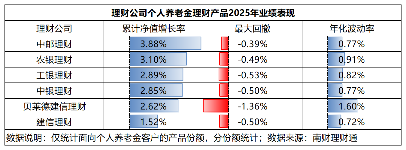分機(jī)構(gòu)來看,中郵理財(cái)個(gè)人養(yǎng)老金產(chǎn)品2025年平均收益率最高,為3.88%,同時(shí)產(chǎn)品最大回撤最低,僅-0.39%,產(chǎn)品性價(jià)比較高。農(nóng)銀理財(cái)次之,平均收益率為3.10%。相比之下,建信理財(cái)個(gè)人養(yǎng)老金產(chǎn)品表現(xiàn)靠后,2025年累計(jì)凈值增長率僅為1.52%。值得注意的是,合資理財(cái)公司貝萊德建信理財(cái)?shù)膫€(gè)人養(yǎng)老金產(chǎn)品風(fēng)險(xiǎn)偏好相對更高,產(chǎn)品最大回撤和年化波動(dòng)率均超過1%。不過,以上只是2025年的收益情況,個(gè)人養(yǎng)老金產(chǎn)品鎖定期限較長,投資者還是更應(yīng)該關(guān)注產(chǎn)品的長期業(yè)績和投資價(jià)值。