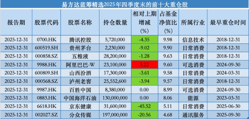資產(chǎn)配置方面,易方達(dá)藍(lán)籌精選2025年四季度末的股票倉位小幅度提升,為93.64%;而該基金前十大重倉股持股集中度則由86.85%降至85.10%。