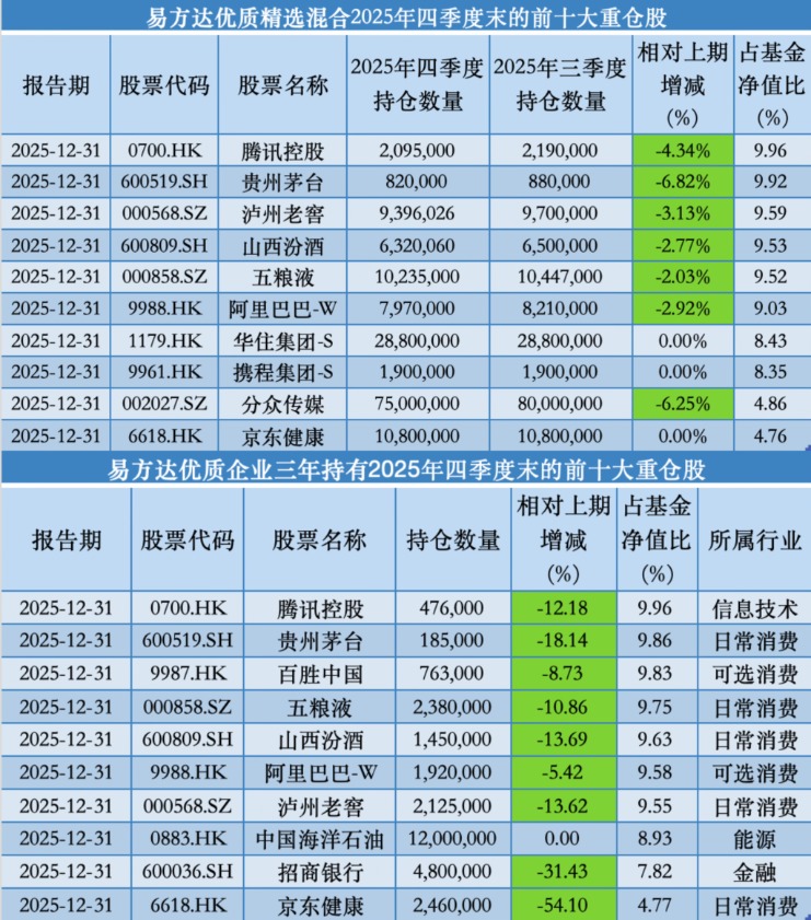 與上述兩只基金類似的是,在2025年四季度,張坤旗下的易方達(dá)優(yōu)質(zhì)精選基金、易方達(dá)優(yōu)質(zhì)企業(yè)三年持有也并未更迭前十大重倉股,僅對部分個股進(jìn)行了減持操作。