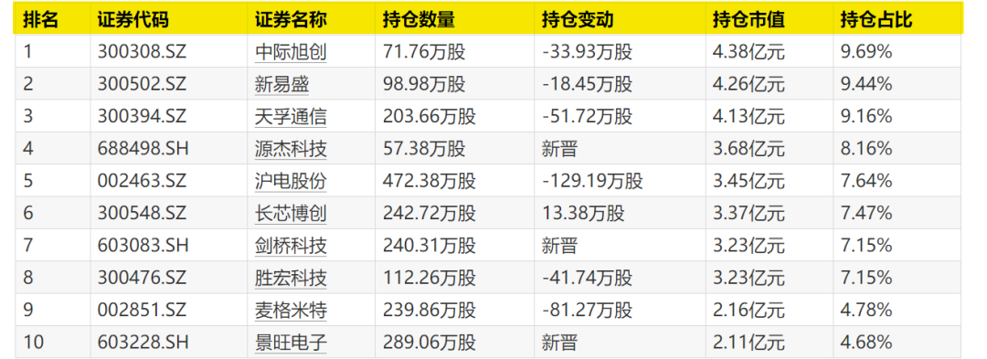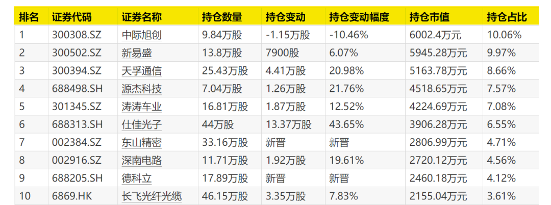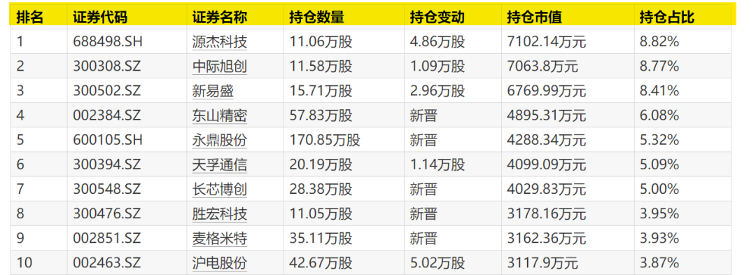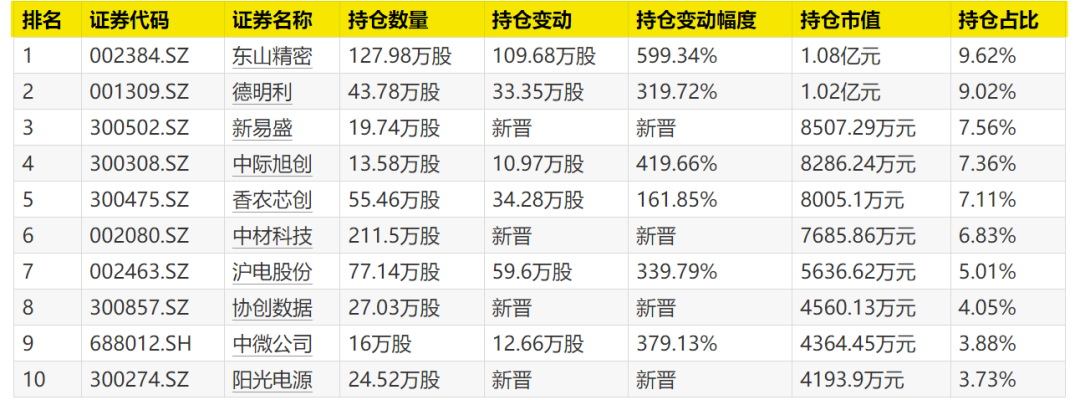 最新持倉顯示,前三大重倉股為東山精密、德明利、新易盛,前兩只個股持倉市值均超1億元。