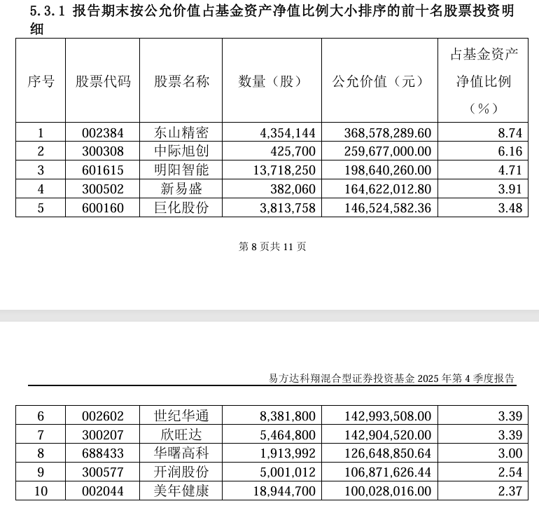 以易方達(dá)基金知名基金經(jīng)理陳皓管理的易方達(dá)科翔為例,該基金2025年四季度重倉的AI相關(guān)板塊貢獻(xiàn)顯著,截至2025年四季度末,該基金前十大重倉股包括中際旭創(chuàng)、新易盛等多只AI概念股。