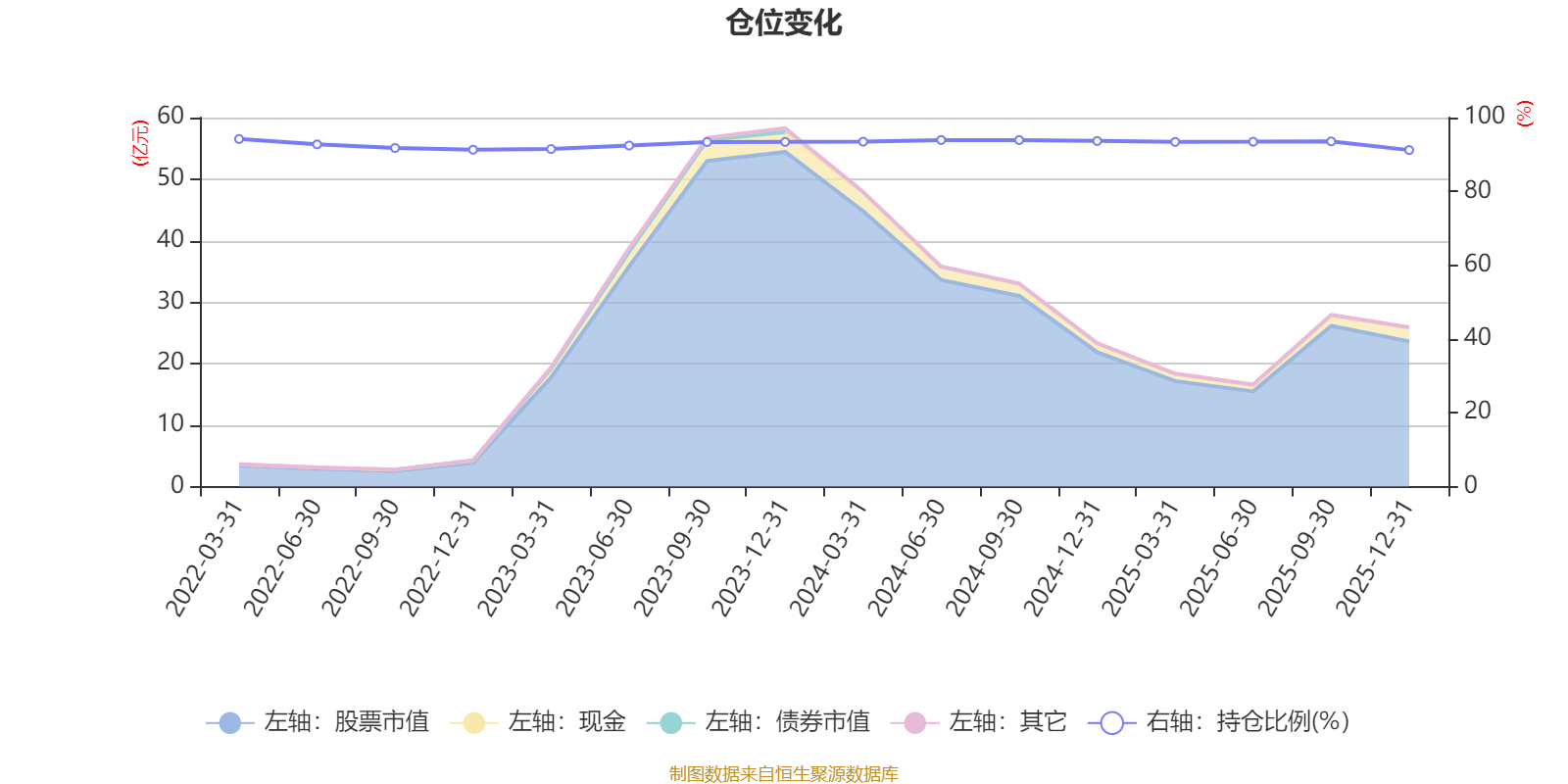 據(jù)定期報告數(shù)據(jù)統(tǒng)計,基金股票倉位長期保持較高水平,近三年平均股票倉位為93.11%,同類平均為88.27%。2022年一季度末基金達(dá)到94.2%的最高倉位,2025年末最低,為91.2%。