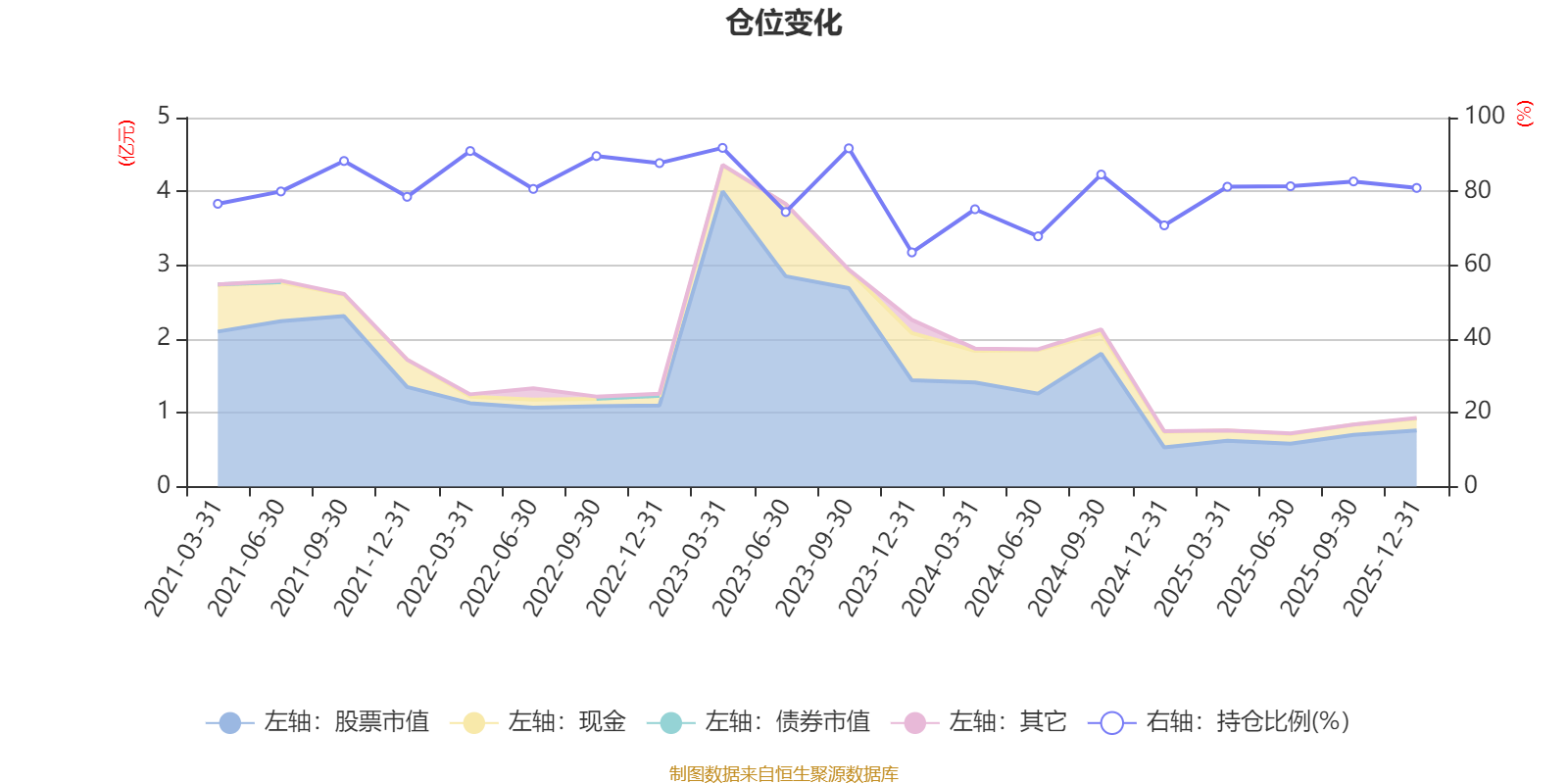 據(jù)定期報告數(shù)據(jù)統(tǒng)計,近三年平均股票倉位為78.83%,同類平均為72.57%。2023年一季度末基金達到91.79%的最高倉位,2023年末最低,為63.46%。