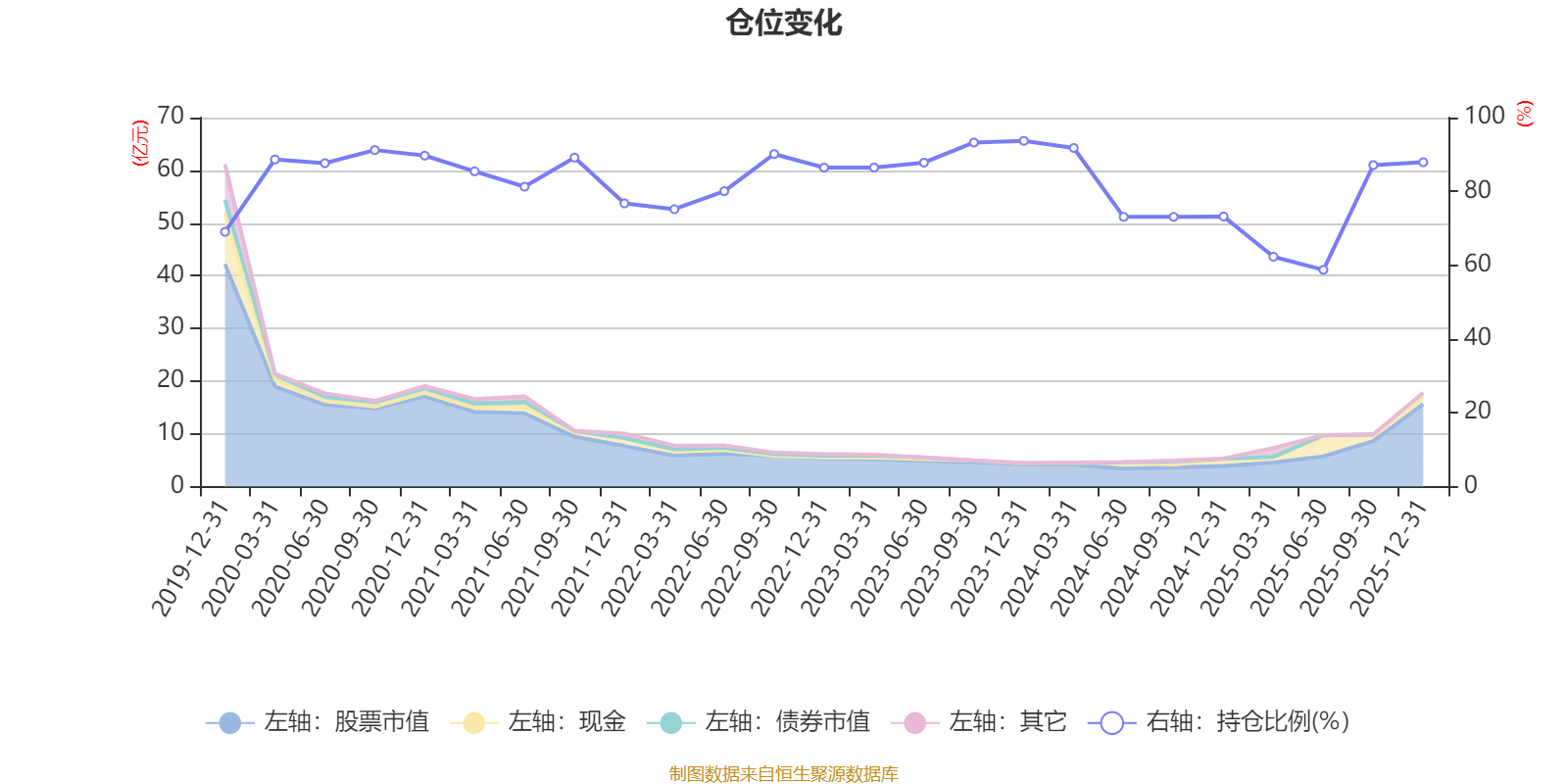 據(jù)定期報告數(shù)據(jù)統(tǒng)計,近三年平均股票倉位為80.7%,同類平均為86.12%。2023年末基金達到93.71%的最高倉位,2025年上半年末最低,為58.74%。