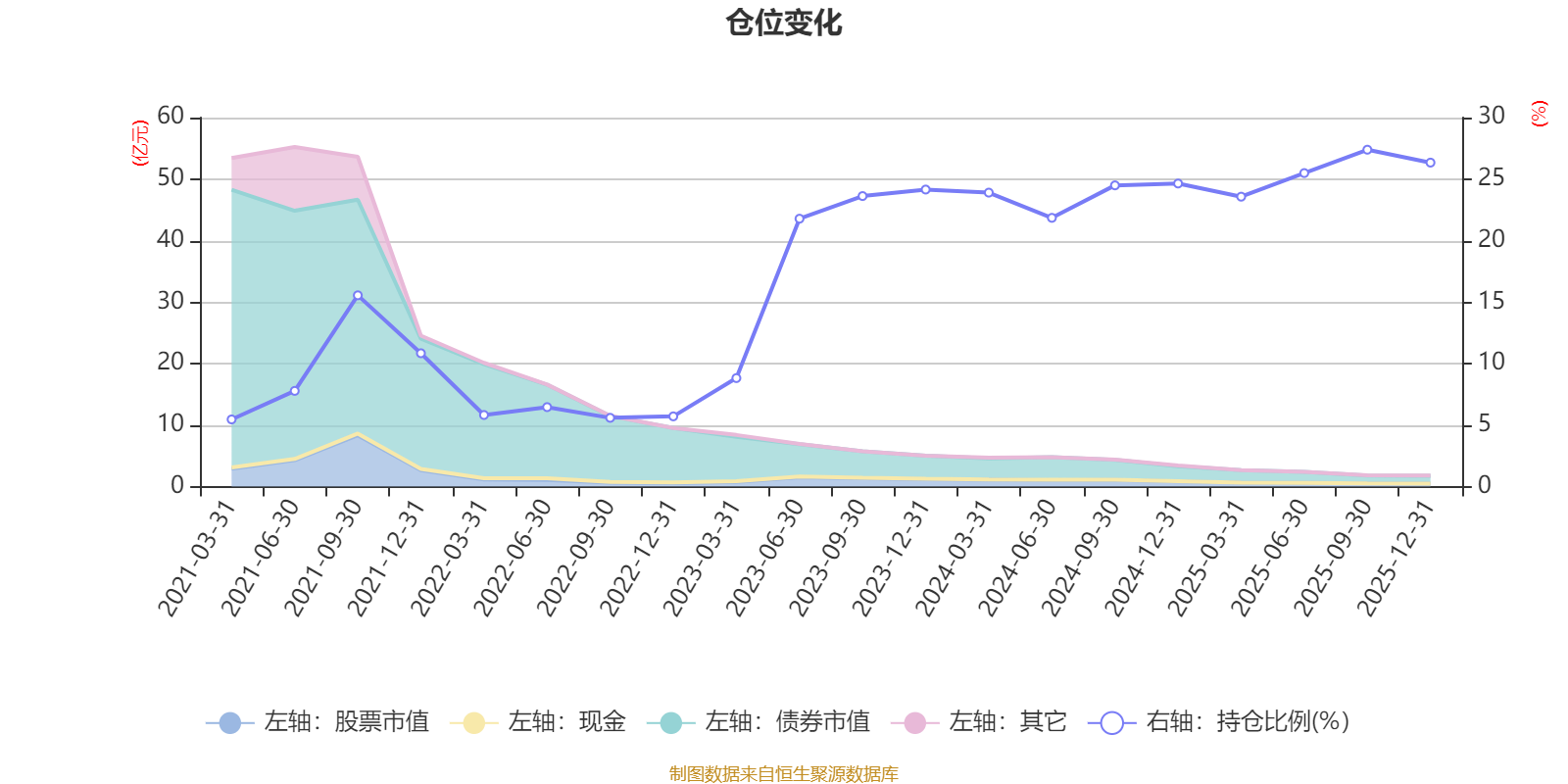 據(jù)定期報告數(shù)據(jù)統(tǒng)計,近三年平均股票倉位為23%,同類平均為19.2%。2025年三季度末基金達到27.39%的最高倉位,2021年一季度末最低,為5.46%。