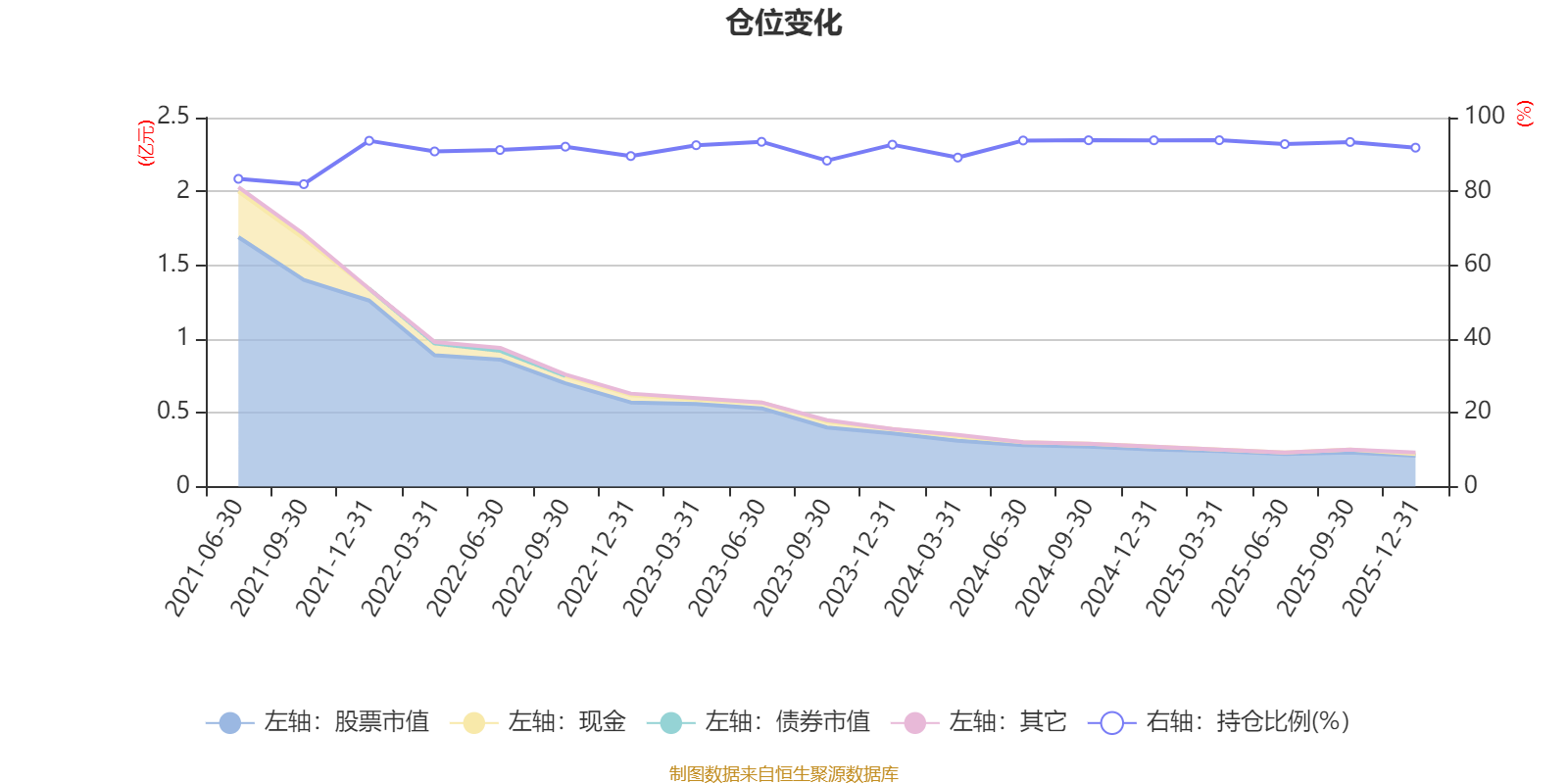 據(jù)定期報(bào)告數(shù)據(jù)統(tǒng)計(jì),近三年平均股票倉位為92.46%,同類平均為84.04%。2025年一季度末基金達(dá)到93.87%的最高倉位,2021年三季度末最低,為81.96%。