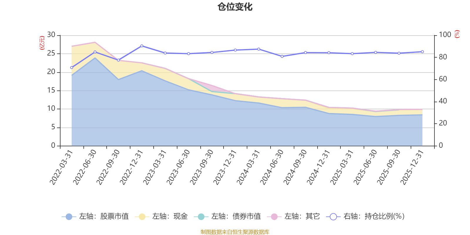 據(jù)定期報(bào)告數(shù)據(jù)統(tǒng)計(jì),近三年平均股票倉(cāng)位為84.33%,同類平均為86.12%。2022年末基金達(dá)到90.38%的最高倉(cāng)位,2022年一季度末最低,為70.79%。