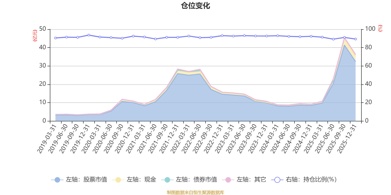 據(jù)定期報(bào)告數(shù)據(jù)統(tǒng)計(jì),近三年平均股票倉位為91.78%,同類平均為72.57%。2019年末基金達(dá)到93.63%的最高倉位,2025年上半年末最低,為89.21%。