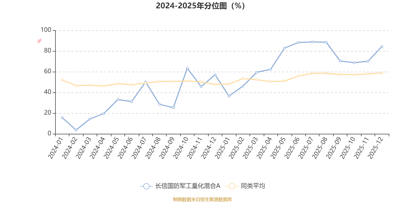 通過所選區(qū)間該基金凈值增長率分位圖,可以觀察該基金與同類基金業(yè)績比較情況。圖為坐標(biāo)原點(diǎn)到區(qū)間內(nèi)某時(shí)點(diǎn)的凈值增長率在同類基金中的分位數(shù)。