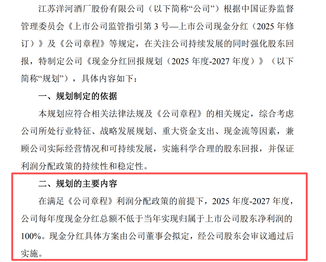 其中,現(xiàn)金分紅回報(bào)規(guī)劃尤為引人注目。洋河股份表示,在滿(mǎn)足《公司章程》利潤(rùn)分配政策的前提下,2025年度-2027年度,公司每年度現(xiàn)金分紅總額不低于當(dāng)年實(shí)現(xiàn)歸母凈利潤(rùn)的100%。