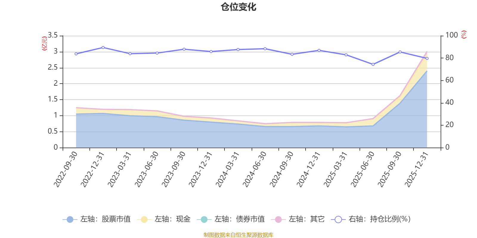 據(jù)定期報(bào)告數(shù)據(jù)統(tǒng)計(jì),近三年平均股票倉位為84.26%,同類平均為84.04%。2022年末基金達(dá)到89.48%的最高倉位,2025年上半年末最低,為74.39%。
