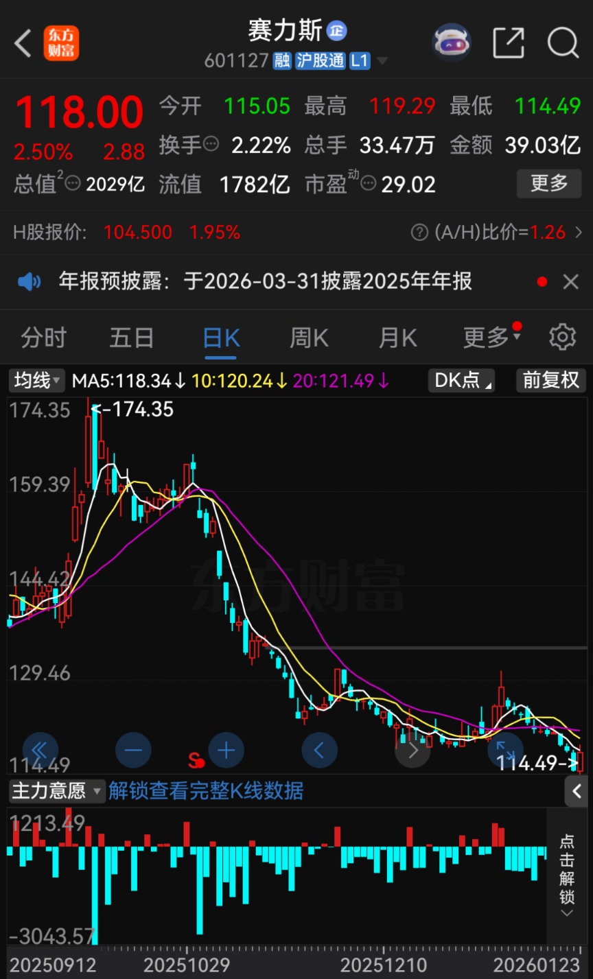 截至1月23日收盤,賽力斯A股股價(jià)報(bào)118元/股,漲幅達(dá)2.50%,總市值為2029億元。
