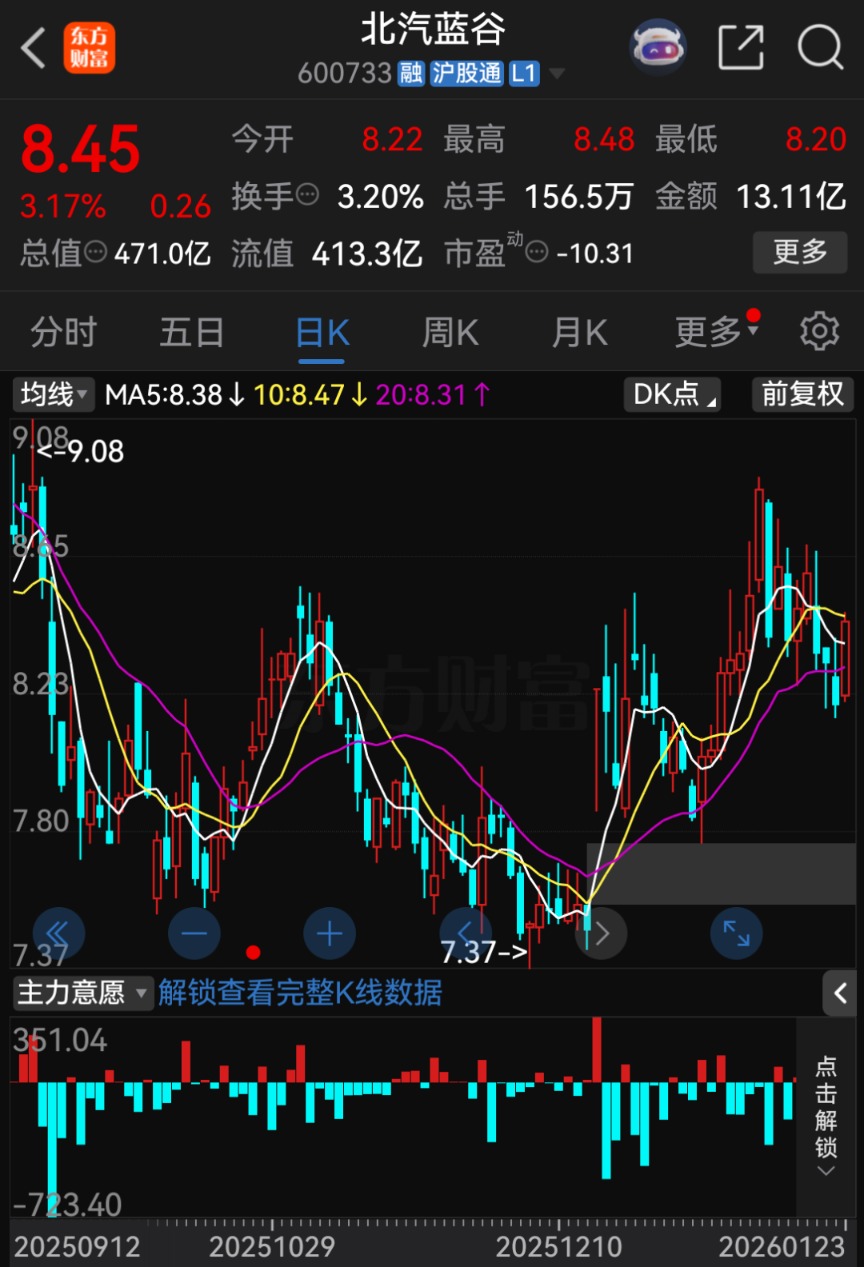 截至1月23日收盤,北汽藍(lán)谷股價(jià)報(bào)8.45元/股,漲幅達(dá)3.17%,總市值為471億元。
