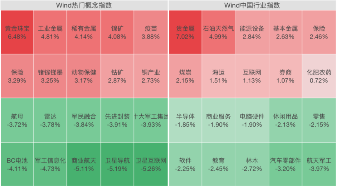盤面上,貴金屬、石油天然氣、大金融等板塊漲幅居前;航天航空、計算機設備、電子化學品等板塊跌幅居前。