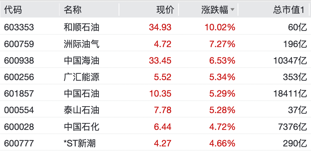 個股方面,中國石油、中國海油、中國石化漲幅均超4%,和順石油漲停,洲際油氣、廣匯能源、泰山石油等紛紛上漲。