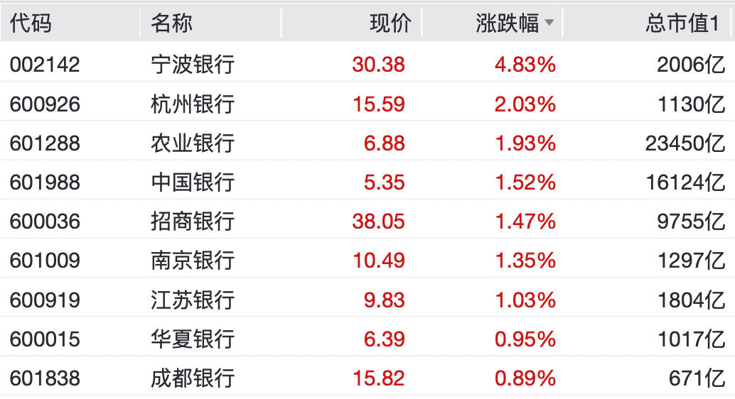 銀行方面,寧波銀行漲近5%,杭州銀行、農(nóng)業(yè)銀行、中國銀行、招商銀行等漲超1%。