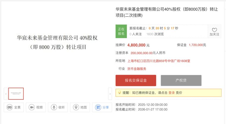 還值得關(guān)注的是,華宸未來基金此前已出現(xiàn)股權(quán)處置動作。記者在全國產(chǎn)權(quán)交易中心官網(wǎng)上看到,華宸未來基金40%股權(quán)(即8000萬股)轉(zhuǎn)讓項目已經(jīng)在二次掛牌,報名時間從2025年12月30日至2026年1月27日。