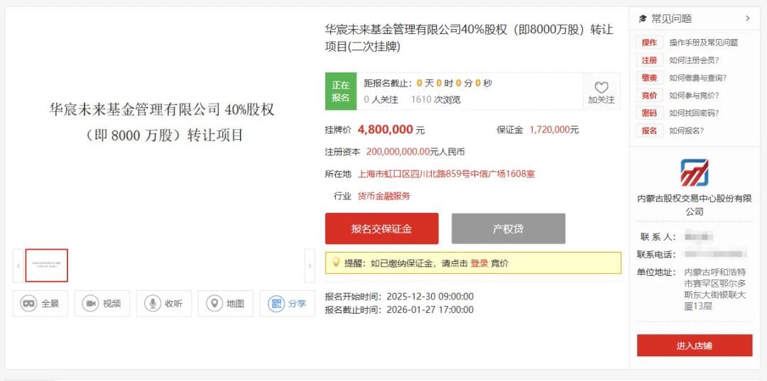 內(nèi)蒙古股權(quán)交易中心官網(wǎng)顯示,華宸未來基金40%股權(quán)在2025年底進(jìn)行了二次掛牌。最新掛牌信息顯示,華宸信托擬轉(zhuǎn)讓持有的40%華宸未來基金股權(quán)(8000萬股),掛牌起始日期為2025年12月30日,截止日期為2026年1月27日。此次掛牌的價格為480萬元,相比1720萬元的首次掛牌價格降價逾七成。若掛牌期滿,如未征集到意向受讓方,將重新掛牌。