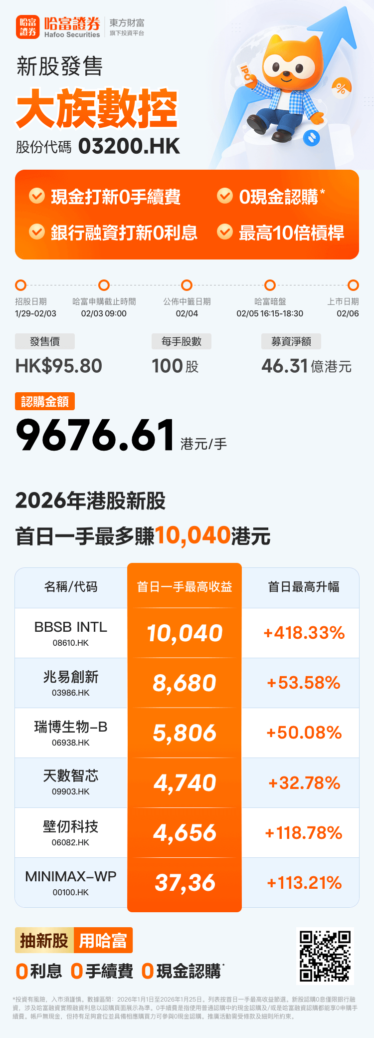 大族數(shù)控發(fā)布公告,于1月29日至2月3日招股,公司擬全球發(fā)售5045.18萬(wàn)股,每股發(fā)售價(jià)不超過(guò)95.8港元,每手100股,入場(chǎng)費(fèi)9676.61港元,中金公司為獨(dú)家保薦人,預(yù)計(jì)將于2月6日開(kāi)始在港交所掛牌交易。