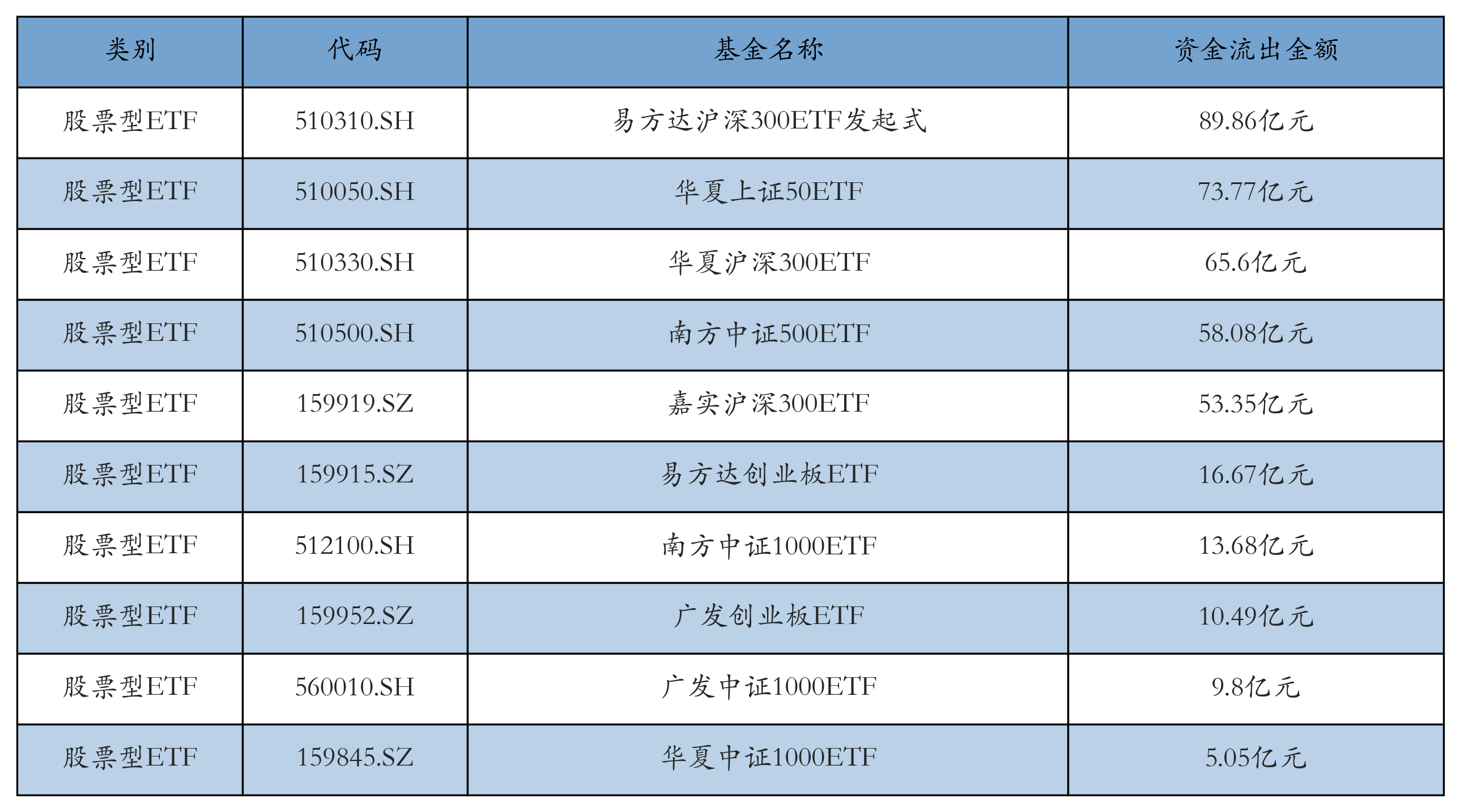昨日股票型ETF資金流出最多的3只ETF及其流出金額分別為:易方達(dá)滬深300ETF發(fā)起式(流出89.86億元)、華夏上證50ETF(流出73.77億元)、華夏滬深300ETF(流出65.6億元)。資金流出前10詳情見下表: