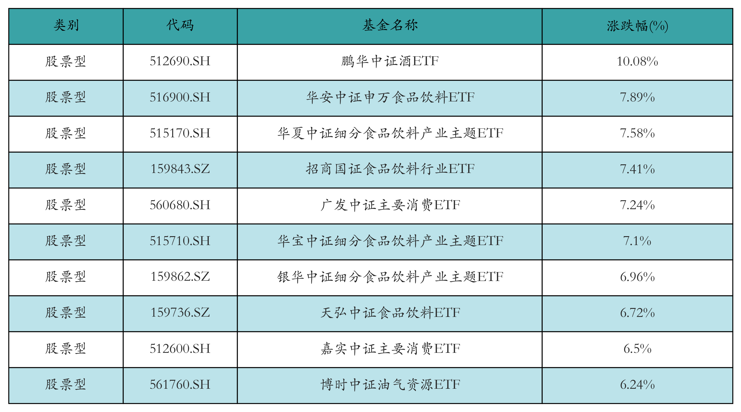 昨日股票型ETF漲幅最高的3只ETF及其收益率分別為:鵬華中證酒ETF(10.08%)、華安中證申萬食品飲料ETF(7.89%)、華夏中證細(xì)分食品飲料產(chǎn)業(yè)主題ETF(7.58%)。漲幅前10詳情見下表: