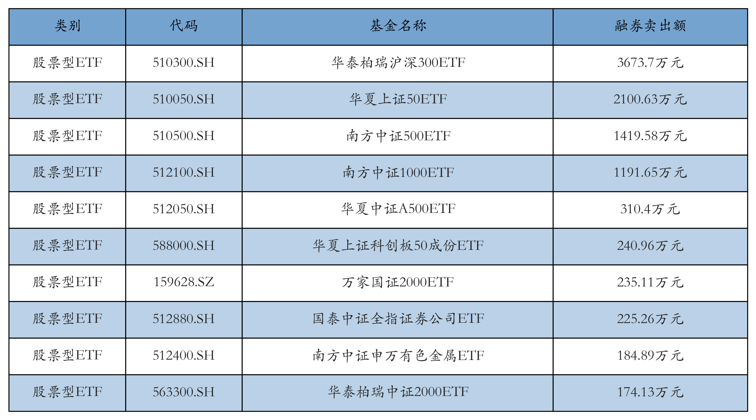 昨日股票型ETF融資賣出額最高的3只ETF及其賣出金額分別為:華泰柏瑞滬深300ETF(3673.7萬元)、華夏上證50ETF(2100.63萬元)、南方中證500ETF(1419.58萬元)。融券賣出額前10詳情見下表: