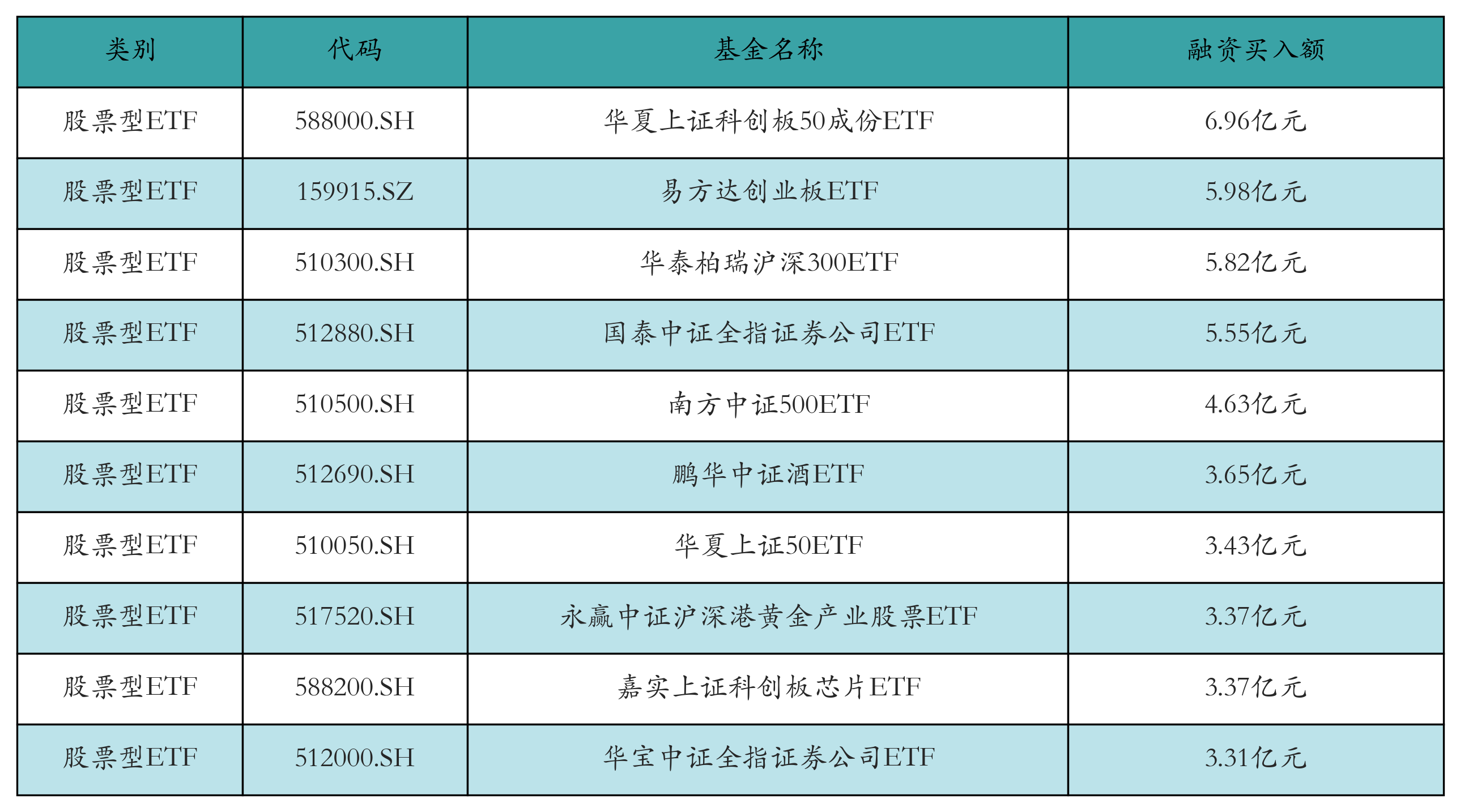 昨日股票型ETF融資買入額最高的3只ETF及其買入金額分別為:華夏上證科創(chuàng)板50成份ETF(6.96億元)、易方達(dá)創(chuàng)業(yè)板ETF(5.98億元)、華泰柏瑞滬深300ETF(5.82億元)。融資買入額前10詳情見下表: