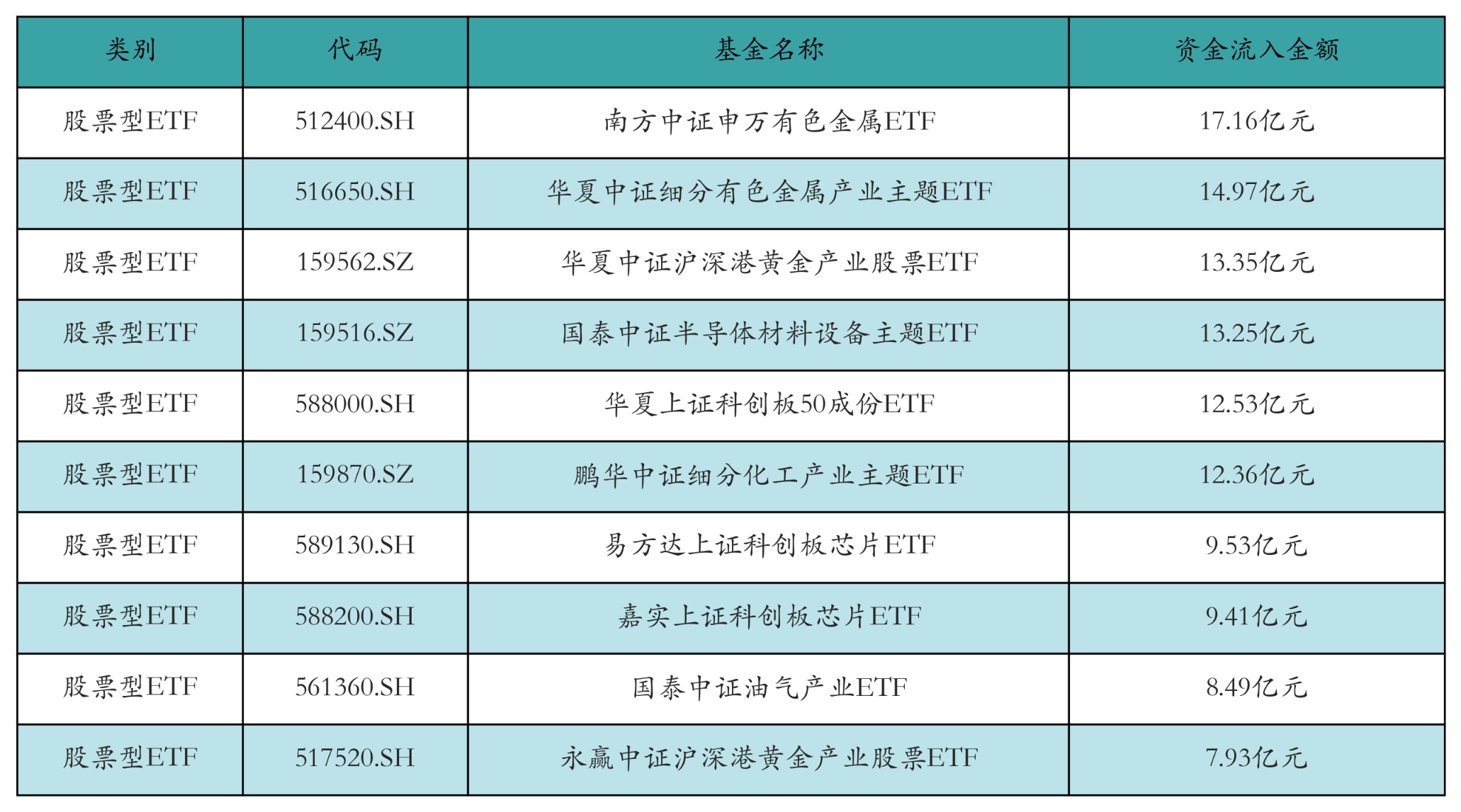 昨日股票型ETF資金流入最多的3只ETF及其流入金額分別為:南方中證申萬有色金屬ETF(流入17.16億元)、華夏中證細(xì)分有色金屬產(chǎn)業(yè)主題ETF(流入14.97億元)、華夏中證滬深港黃金產(chǎn)業(yè)股票ETF(流入13.35億元)。資金流入前10詳情見下表: