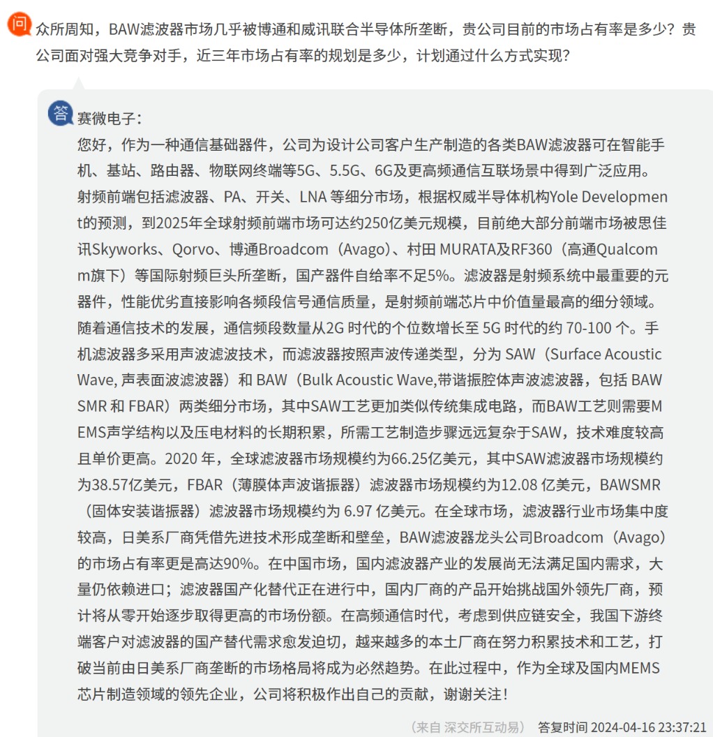 賽微電子在互動平臺表示,與武漢敏聲的合作覆蓋了多款BAW濾波器的工藝開發(fā)與量產(chǎn),且良率水平大幅提升。對賽微電子而言,其核心合作伙伴武漢敏聲的產(chǎn)品能否在性能和成本上,與新聲半導(dǎo)體、諾思微系統(tǒng)以及獲得小米集團(tuán)(01810.HK)加持的武漢光鉅等對手的競爭,將在一定程度上影響其業(yè)績。