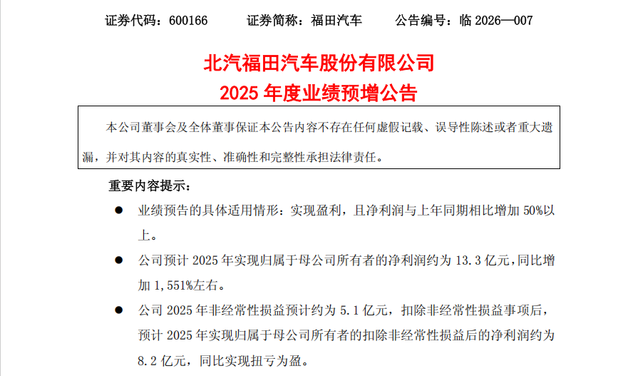 1月30日,福田汽車發(fā)布業(yè)績預(yù)告稱,預(yù)計公司2025年的歸母凈利潤約為13.3億元,同比增長1551%;扣非后凈利潤為8.2億元,同比實現(xiàn)扭虧為盈。
