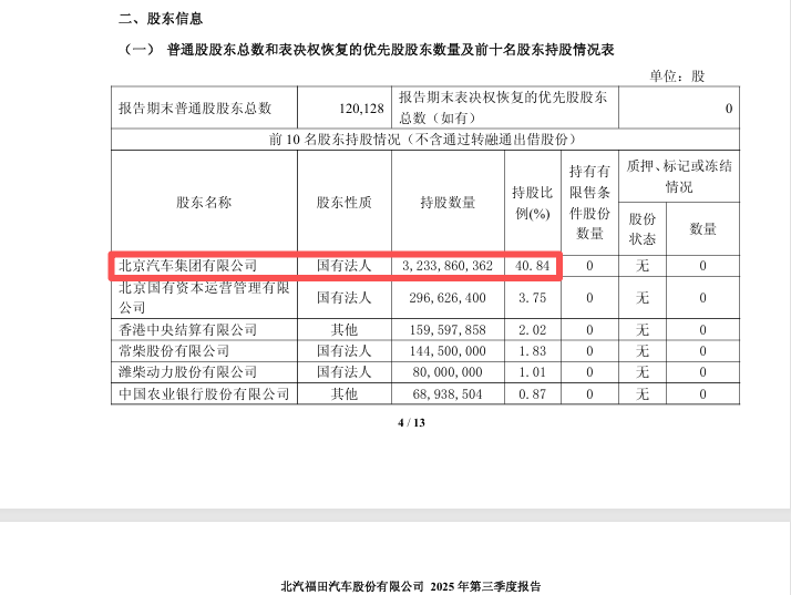 北汽集團是福田汽車的控股股東。截至2025年第三季度末,北汽集團直接持有福田汽車40.84%的股份。