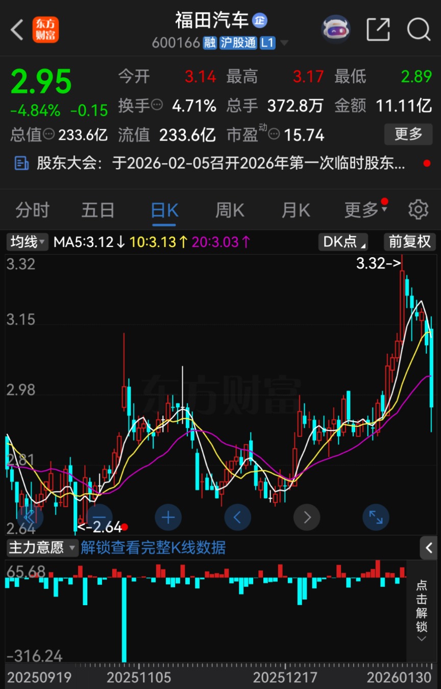 1月30日收盤,福田汽車股價報2.95元/股,跌幅達4.84%,總市值為233.6億元。
