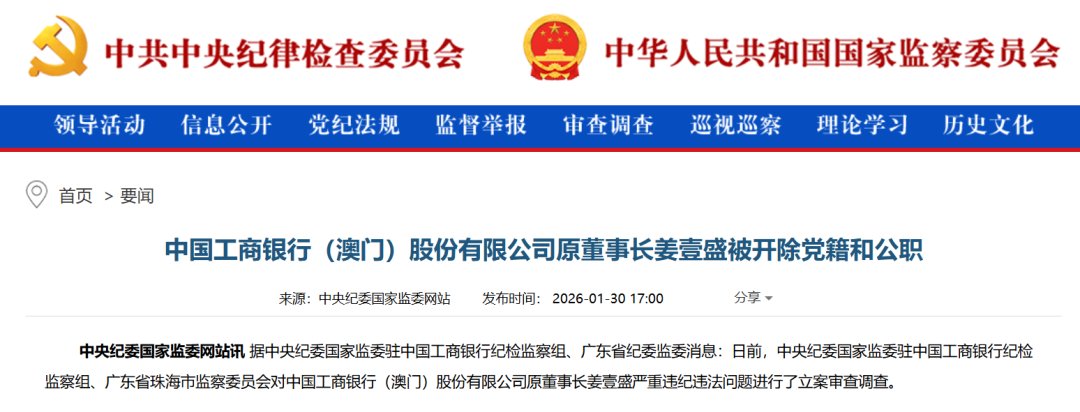 1月30日,中央紀(jì)委國家監(jiān)委官網(wǎng)通報:中國工商銀行(澳門)股份有限公司原董事長姜壹盛被開除黨籍和公職。