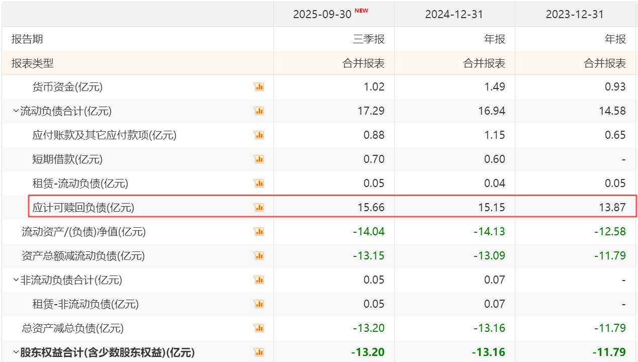 2023年至2025年9月末,可贖回負(fù)債分別為13.87億元、15.15億元和15.66億元,這直接導(dǎo)致公司凈資產(chǎn)為負(fù),當(dāng)期公司凈資產(chǎn)分別為-11.79億元、-13.16億元、-13.2億元。