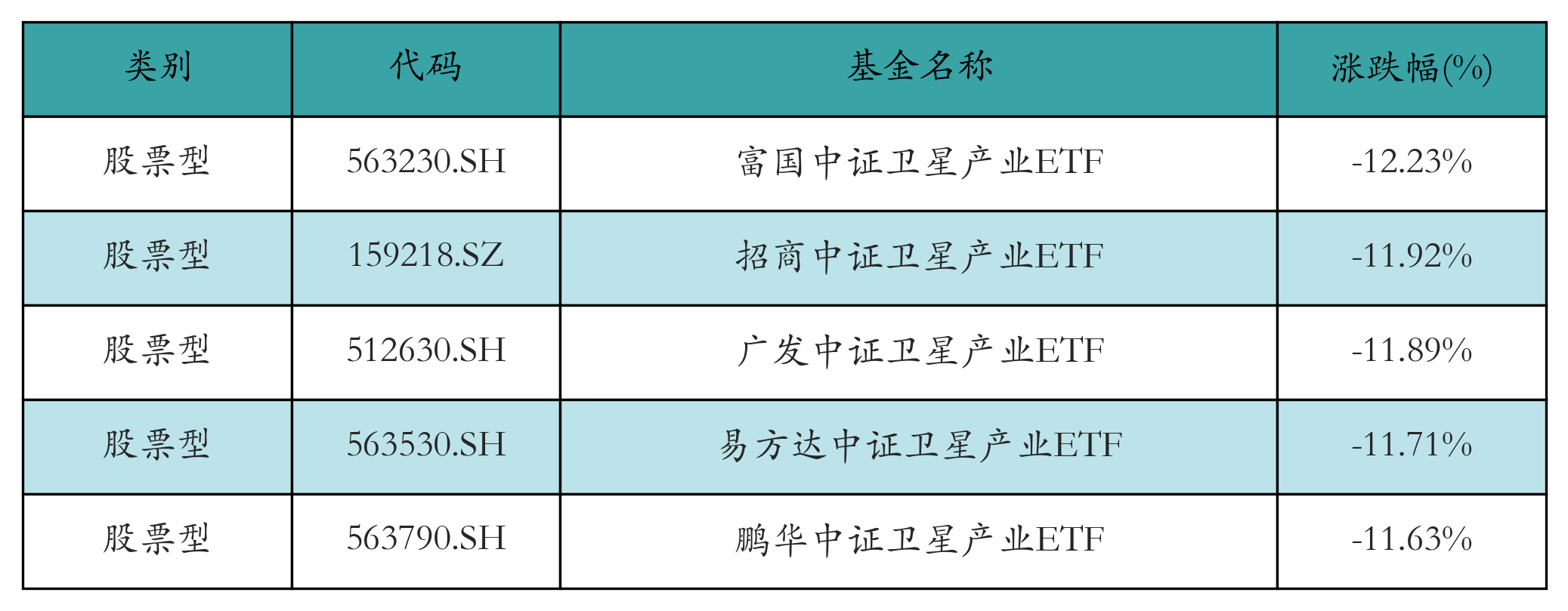上周股票型ETF跌幅最大的5只ETF及其收益率分別為:富國中證衛(wèi)星產(chǎn)業(yè)ETF(-12.23%)、招商中證衛(wèi)星產(chǎn)業(yè)ETF(-11.92%)、廣發(fā)中證衛(wèi)星產(chǎn)業(yè)ETF(-11.89%)、易方達(dá)中證衛(wèi)星產(chǎn)業(yè)ETF(-11.71%)、鵬華中證衛(wèi)星產(chǎn)業(yè)ETF(-11.63%)。詳情見下表: