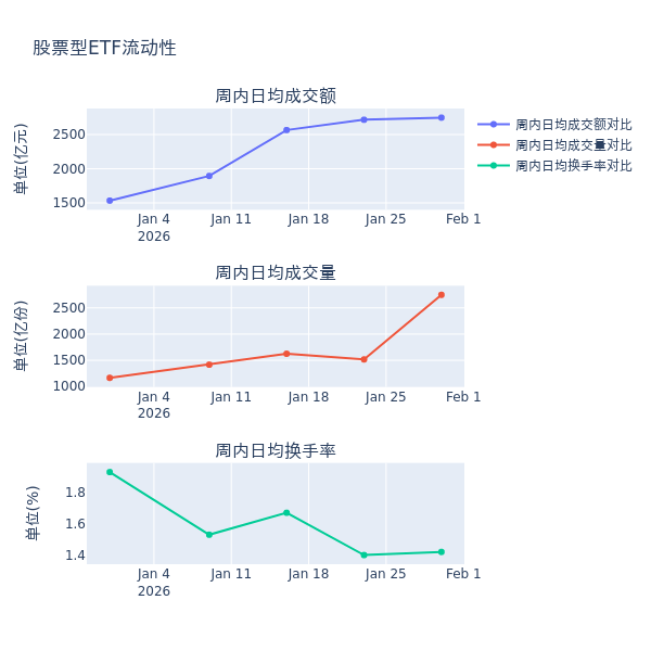流動性方面,上周股票型ETF市場日均成交額增加1.1%,日均成交量增加81.1%,換手率增加0.02%。