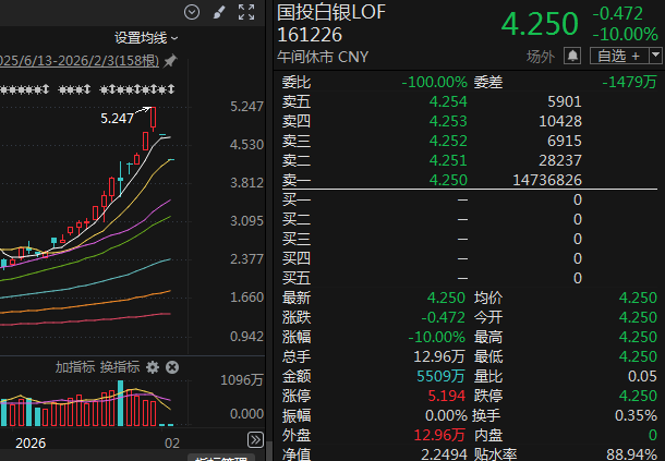 值得注意的是,2月2日晚間,國(guó)投白銀LOF公告調(diào)整估值,當(dāng)日?qǐng)鐾鈨糁稻薹碌?1.5%。按2月3日該基金的跌停價(jià)計(jì)算,目前其場(chǎng)內(nèi)溢價(jià)率依然高達(dá)88.94%。