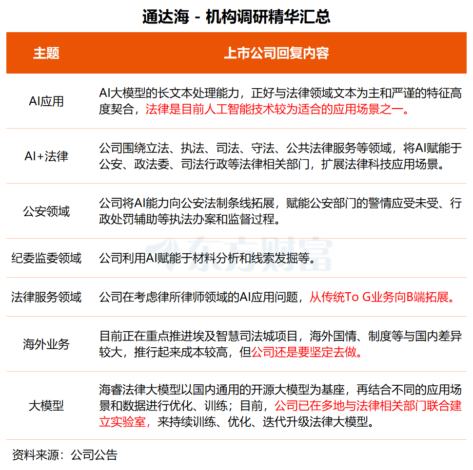 通達(dá)海2月2日與投資者交流時表示,法律是目前人工智能技術(shù)較為適合的應(yīng)用場景之一,公司也在積極推進(jìn)“AI+法律”戰(zhàn)略,圍繞立法、執(zhí)法、司法、守法、公共法律服務(wù)等領(lǐng)域,將AI賦能于公安、政法委、司法行政、仲裁、紀(jì)委監(jiān)委等法律相關(guān)部門,擴(kuò)展法律科技應(yīng)用場景。