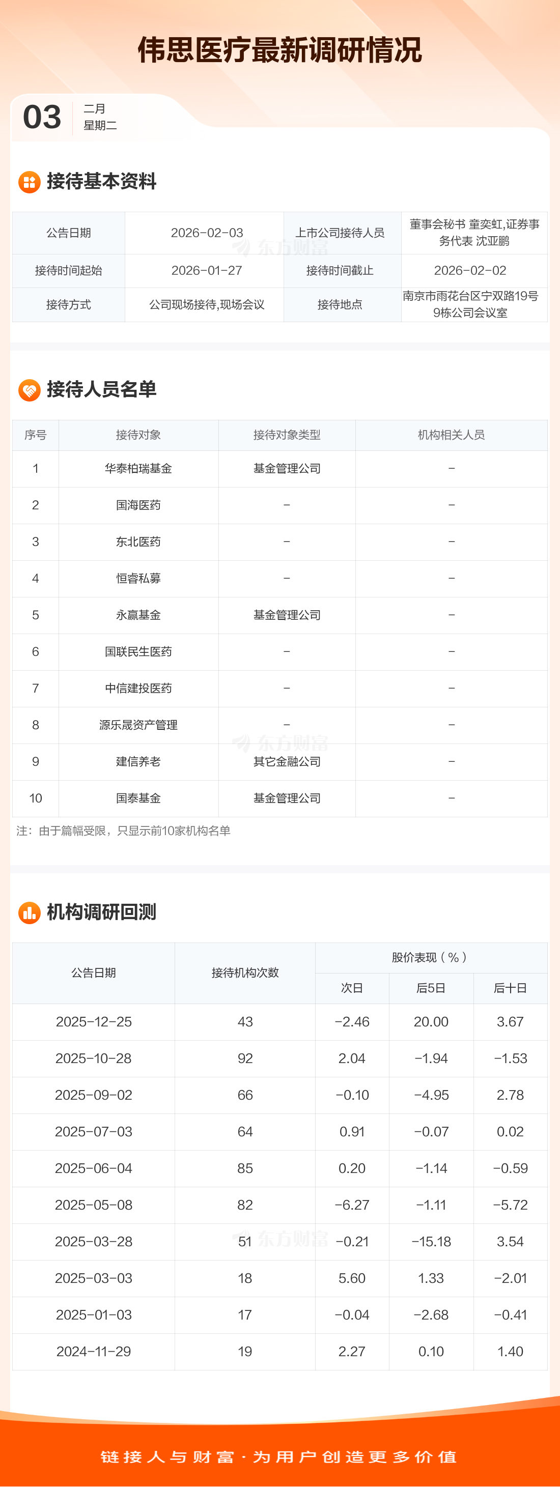 偉思醫(yī)療2月3日公告稱,1月27日至2月2日接待華泰柏瑞基金等40家機構(gòu)調(diào)研。接待人員包括董事會秘書 童奕虹,證券事務(wù)代表 沈亞鵬。