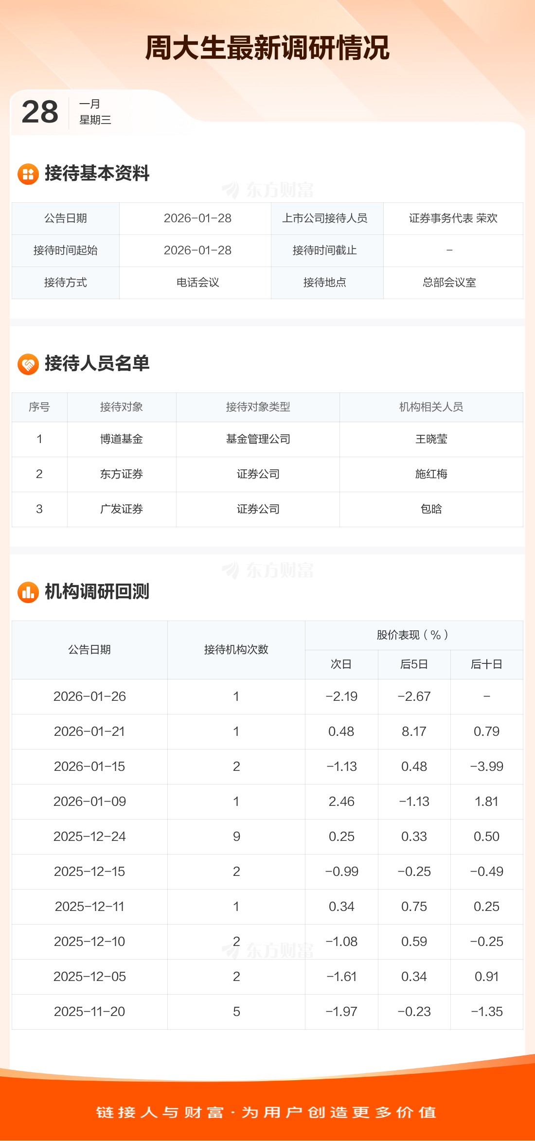 周大生1月28日公告稱,1月28日接待博道基金等3家機構調研。接待人員包括證券事務代表 榮歡。