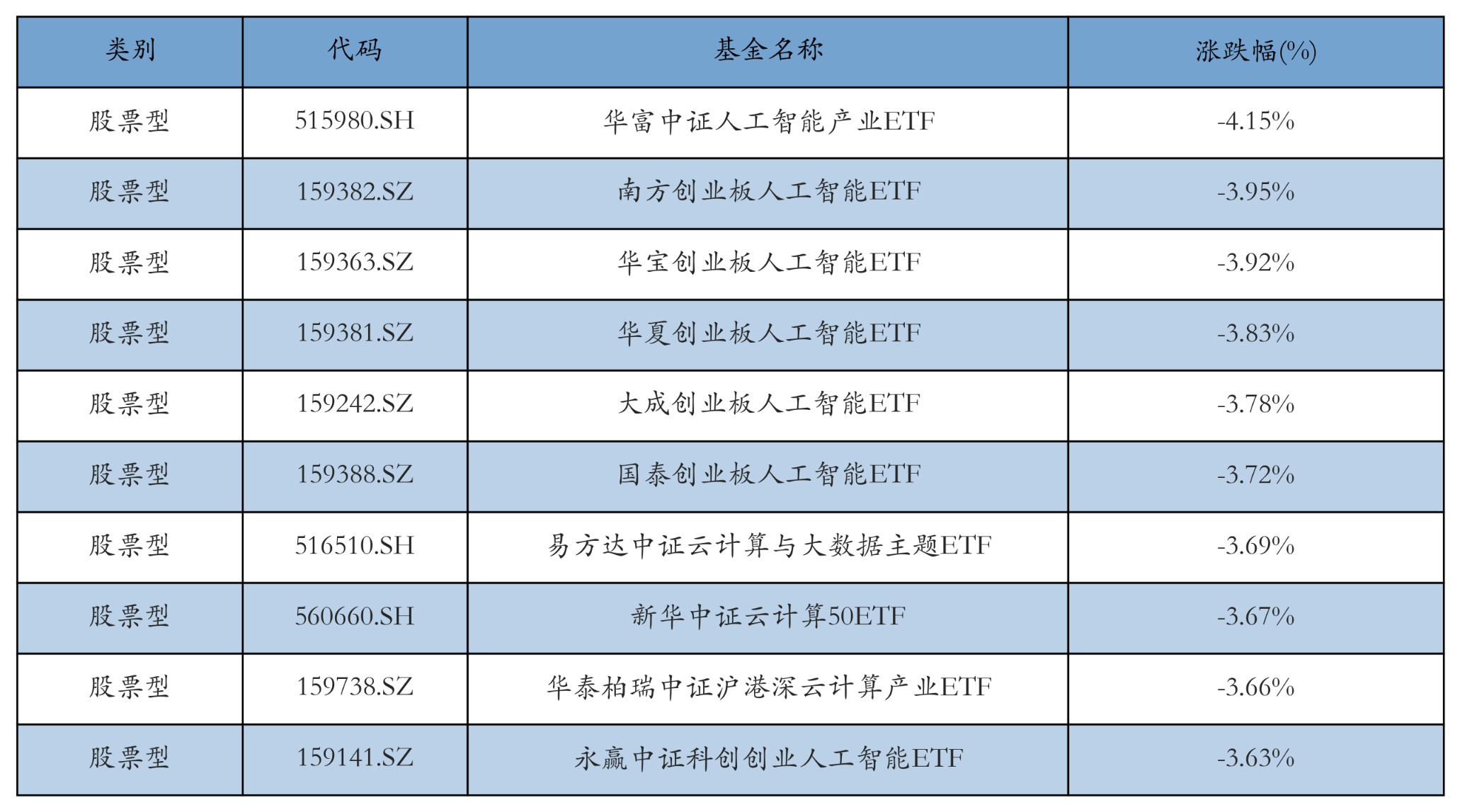 昨日股票型ETF跌幅最大的3只ETF及其收益率分別為:華富中證人工智能產(chǎn)業(yè)ETF(-4.15%)、南方創(chuàng)業(yè)板人工智能ETF(-3.95%)、華寶創(chuàng)業(yè)板人工智能ETF(-3.92%)。跌幅前10詳情見下表: