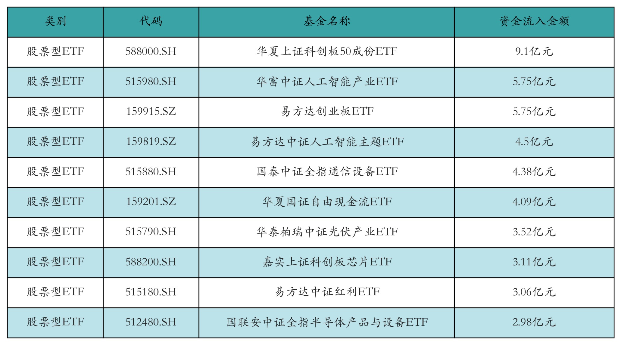 昨日股票型ETF資金流入最多的3只ETF及其流入金額分別為:華夏上證科創(chuàng)板50成份ETF(流入9.1億元)、華富中證人工智能產(chǎn)業(yè)ETF(流入5.75億元)、易方達(dá)創(chuàng)業(yè)板ETF(流入5.75億元)。資金流入前10詳情見下表:
