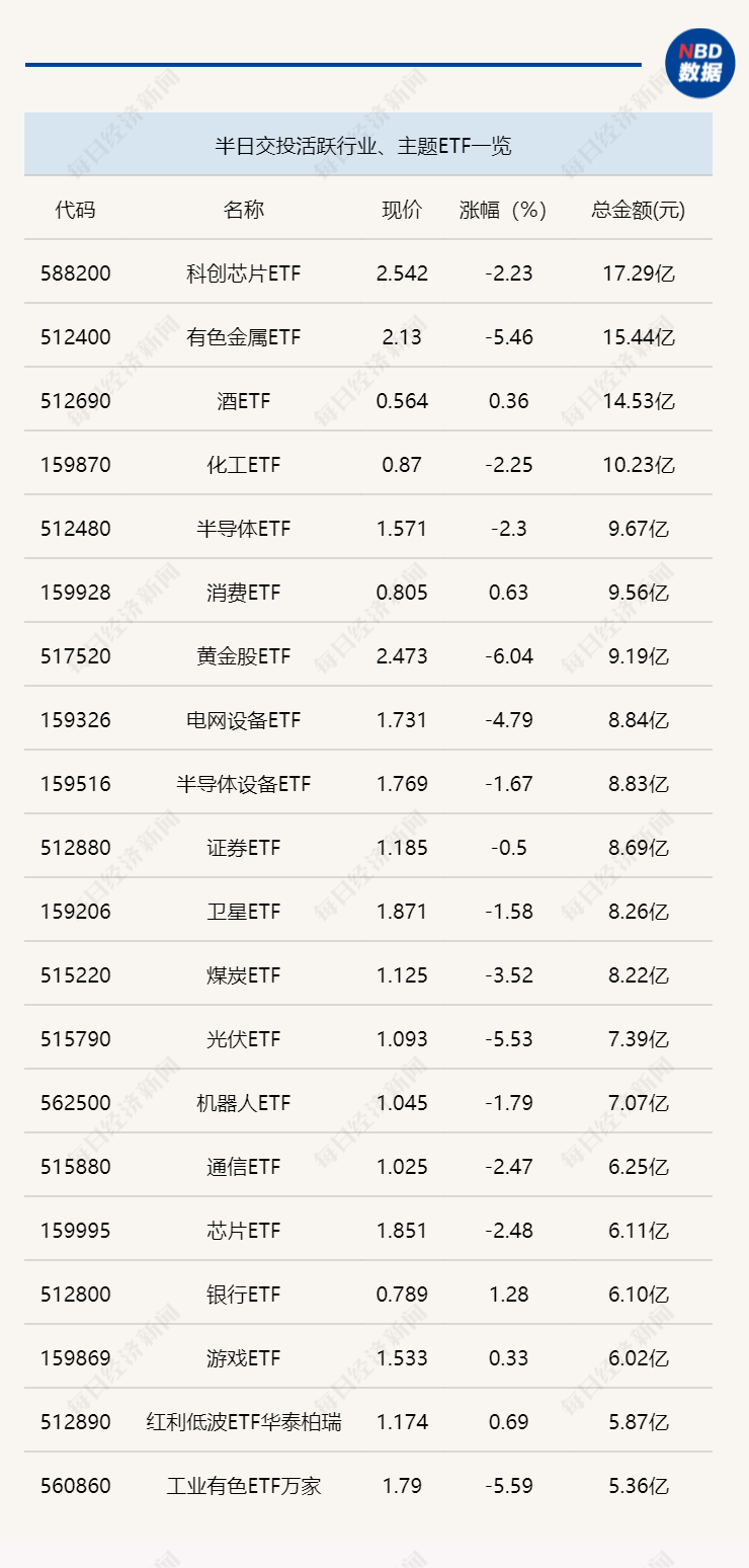 2月5日上午,行業(yè)、主題ETF交易量依舊平淡,科創(chuàng)芯片(588200)和有色金屬(512400)半日成交金額超過15億元;跨境ETF方面,恒生科技指數(shù)ETF(513180)半日成交金額近45億元,成交量相對較大。