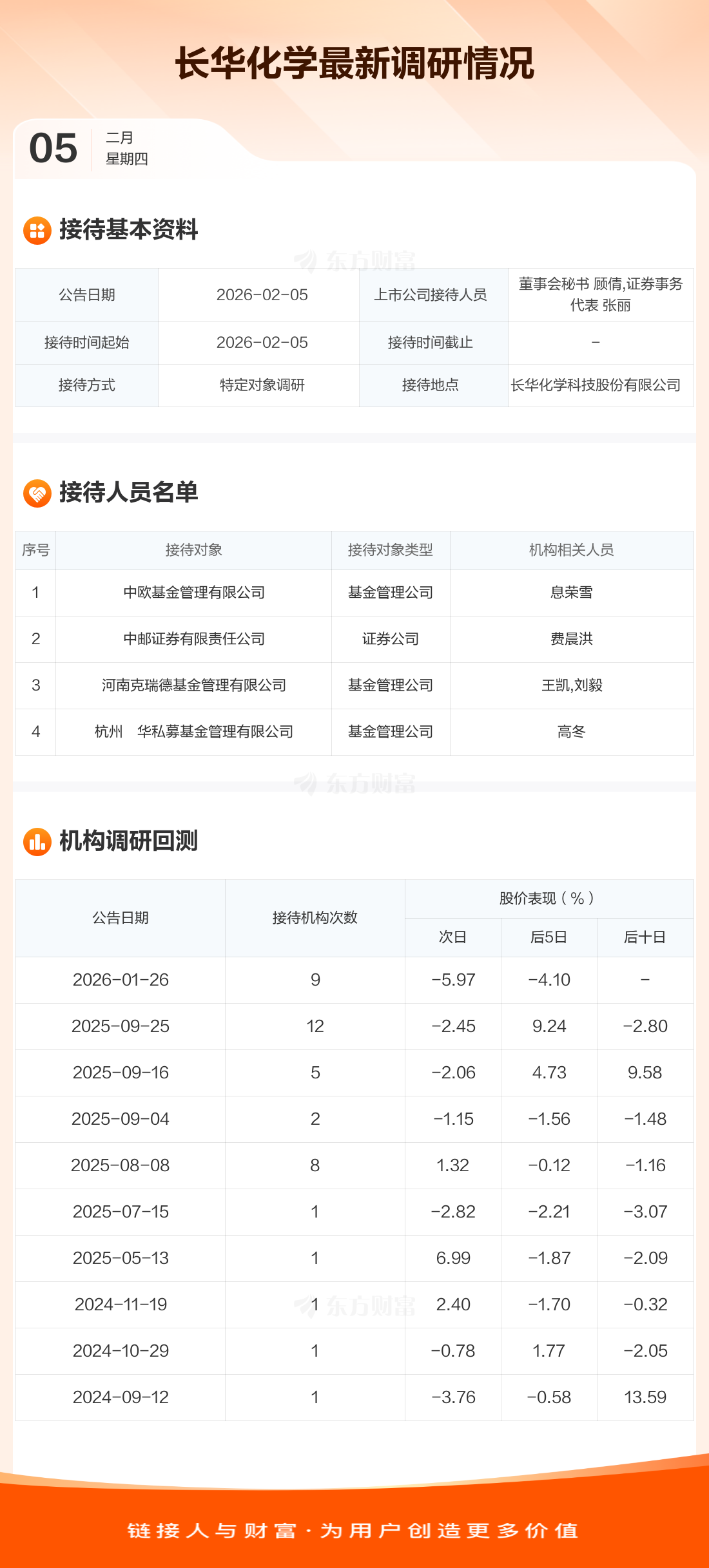 長(zhǎng)華化學(xué)2月5日公告稱,2月5日接待中歐基金管理有限公司等4家機(jī)構(gòu)調(diào)研。接待人員包括董事會(huì)秘書 顧倩,證券事務(wù)代表 張麗。