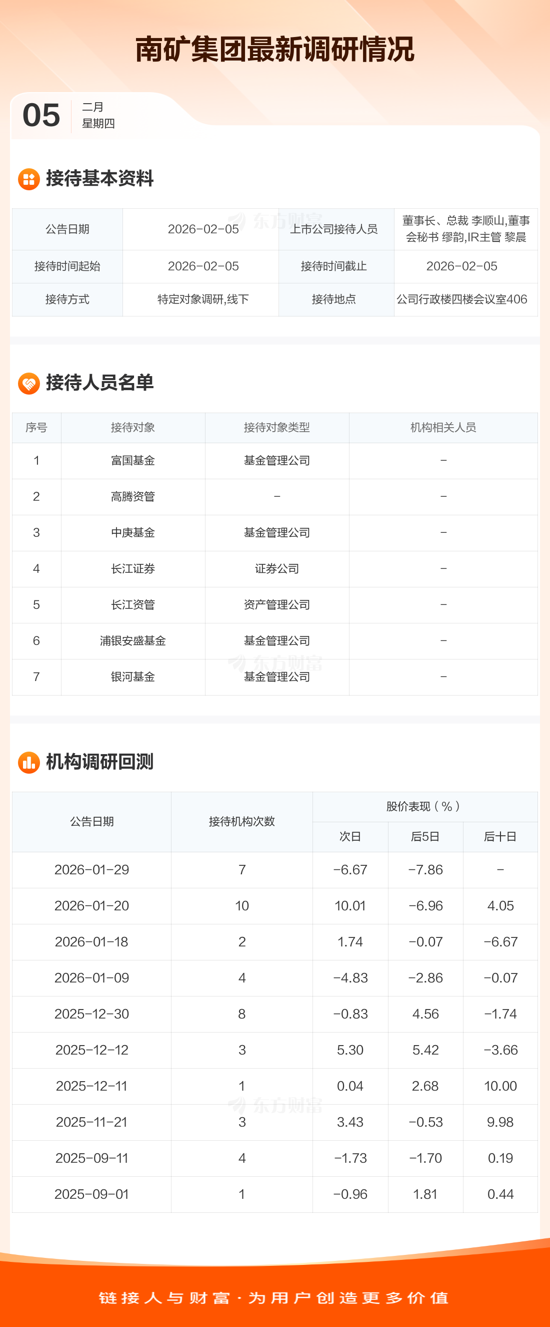 南礦集團(tuán)2月5日公告稱,2月5日接待富國(guó)基金等7家機(jī)構(gòu)調(diào)研。接待人員包括董事長(zhǎng)、總裁 李順山,董事會(huì)秘書 繆韻,IR主管 黎晨。