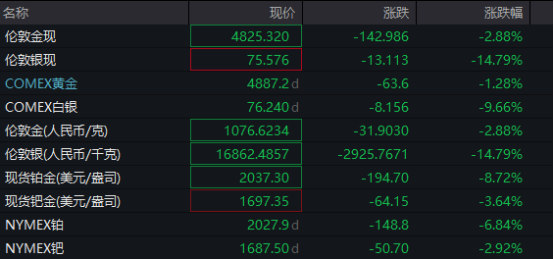 2月5日,國際黃金、白銀價格再度大幅走低。其中,現(xiàn)貨黃金一度跌超3%;現(xiàn)貨白銀更是一度跌超17%,最低跌破74美元/盎司關(guān)口。受此影響,貴金屬全線走低。