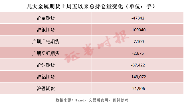 在黃金和白銀之外,國內(nèi)期貨市場中,鉑、鈀、銅、鋁、錫等金屬期貨的總持倉量也隨著相關(guān)品種價格的波動而出現(xiàn)下滑。
